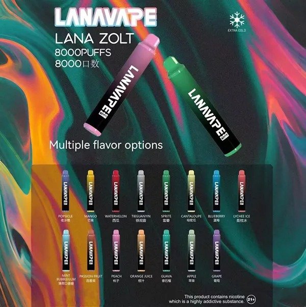 每支LANA ZOLT 8000口抛棄式電子煙的油倉可容納高達 15ml 煙油,可提供多達 8000 次的吸入,確保持久的使用體驗,無需頻繁添加煙油,方便實用。內置 850mAh 的純鈷電池提供強勁動力,讓 LANA VAPE能夠提供持久續航,讓您無需擔心電量問題,持續享受吸煙樂趣。LANA一次性電子菸提供多款口味選擇,從清新的薄荷到豐富的水果,讓你的每一次吸入都充滿驚喜。煙油成分包括甘油、丙二醇、香精、有機尼古丁,解癮成分含有3%尼古丁,無0焦油,確保健康和安全。